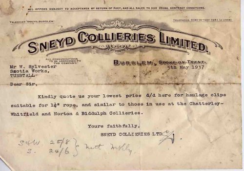 A letter from Sneyd Colliery in May 1937