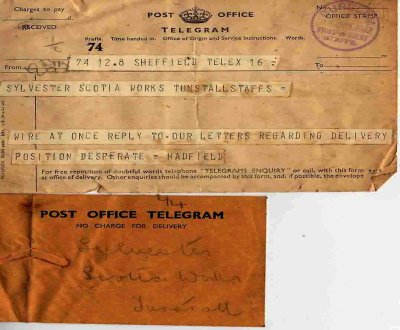 Soon it was war time; although it would be against Walter's nature to support the war there is no doubt that both he and the company did their duty. It is impossible to underestimate the pivotal position Walter found himself in. His numerous inventions were desperately needed to produce the coal required for British industry. Before and during the war Sylvesters factory were extremely busy filling orders for coal mines all over the country. We have letters, order forms, receipts and telegrams some of which are shown below.