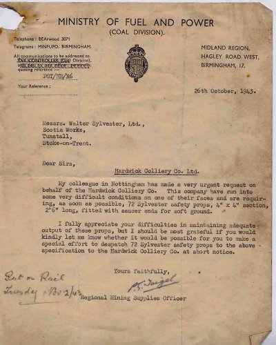 Later in the year Walter received a letter from the Midland Region of the Ministry of Fuel and Power to the effect that Hardwick Colliery, Nottingham were desperate for 72 Sylvester safety props and the regional Mining Supplies Officer Mr Taigel would take it as a personal favour if Walter could oblige on this occasion.