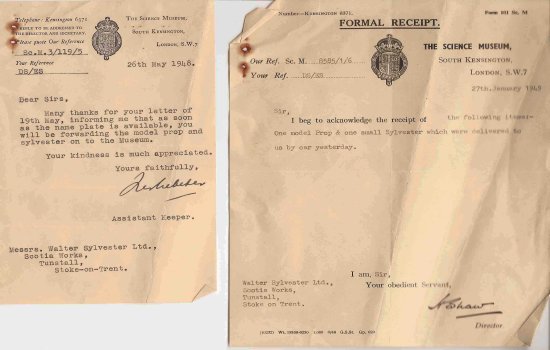 In 1948 a letter was sent to Walter Sylvester Ltd, Scotia Works, Pinnox Street, Tunstall,(see below left) from Mr H. Shaw, Director of the Science Museum, South Kensington, London, S.W.7 to the effect.