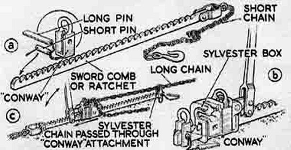 Walter's original specification Patent No 9396 dated the 13th of May 1895 calls his device an appliance. In December 1896 at a meeting of the North Staffordshire Institute of Mining and Mechanical Engineers a paper was read by Mr E.B. Wain, M.Inst.C.E. regarding an improved method for withdrawing pit props. He then went on to describe the machine and highlighted its benefits. Mr Wain also said that he had used this machine away from the face for lifting wagons back onto the rails and for helping in a mess. (A mess describes the after effects of runaway wagons, full and empty colliding in an underground roadway) He was of the opinion that this new machine was much better than the one presently in use especially given its leveragepotential of 30 to 1 compared with the present machines that rate only 7 to 1. Another member of the Institute Mr J. Heath considered that the machine was a very good one and he had used it successfully where other dogs (machines) had failed. The machine of course was the Sylvester. At the end of the meeting Mr Sylvester said the machines cost 1.10s and at present there are 24 at Whitfield colliery and a further 18 in other places. Given the rapid expansion in the use of Sylvesters machines I think we can say the meeting went well.