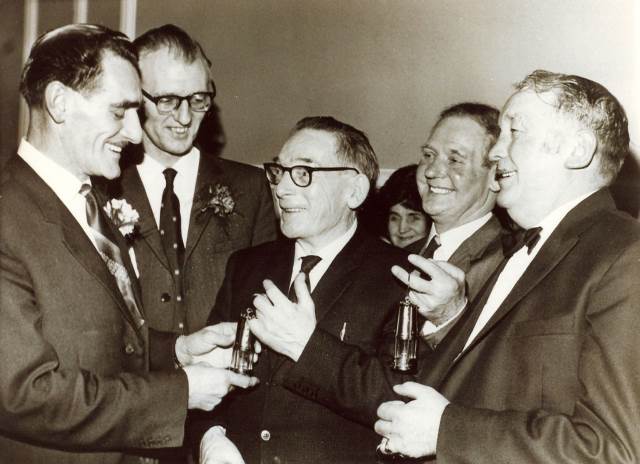 | Arthur Richards, Surface Superintendant, making a presentation to Albert Morse, NACODS, a retiring Overman. Between them is George Adamthwaits. Both George and Albert are from the Coalville Estate Weston Coyney. The Date of the ceremony was the 6th Feb 1971. The other participants are unknown at the moment. |